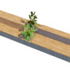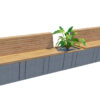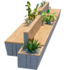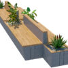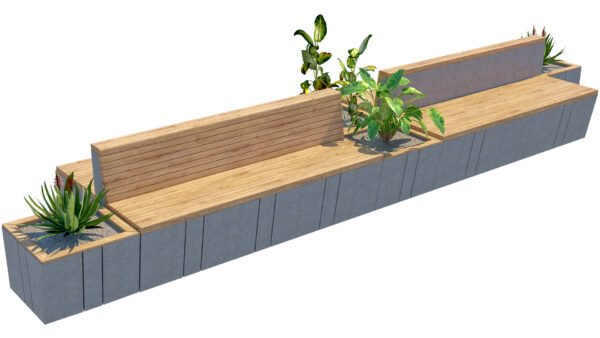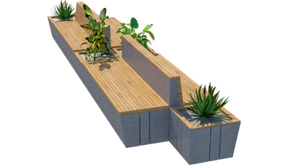 The design features extended wooden seating surfaces, vertical wooden backrests, and strategically placed planter boxes filled with decorative greenery. The combination of natural wood textures and smooth concrete materials creates a balanced, modern look suitable for architectural visualizations and landscape presentations.