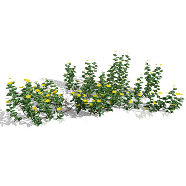 This asset features three distinct plant variations, ranging from a dense, flowering cluster to a spreading ground cover, allowing you to scatter them naturally across your scene without repetition. Each model is meticulously texturized to showcase the plant’s characteristic pinnate leaves and vibrant yellow five-petaled flowers, ensuring it holds up even in close-up renders.