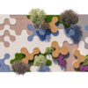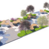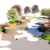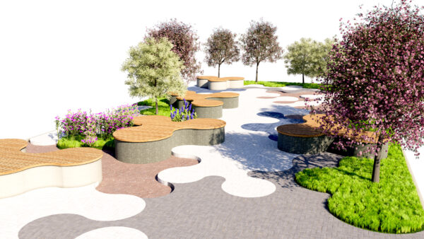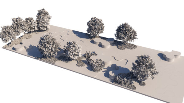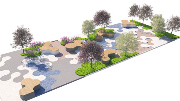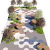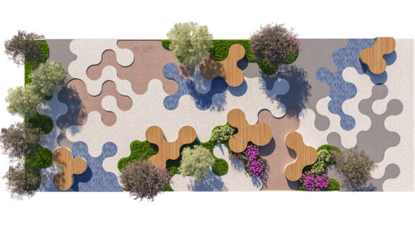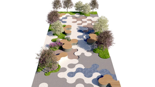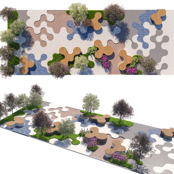 This model showcases a sophisticated “puzzle-piece” paving system that seamlessly integrates hardscaping with softscaping. The central focus is the custom-designed, amorphous wooden benches that provide ample seating while maintaining a sculptural presence.