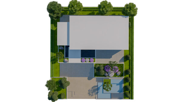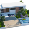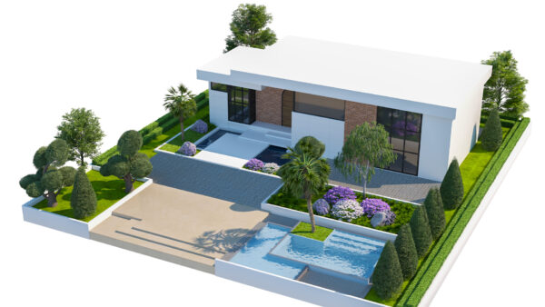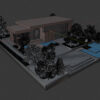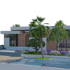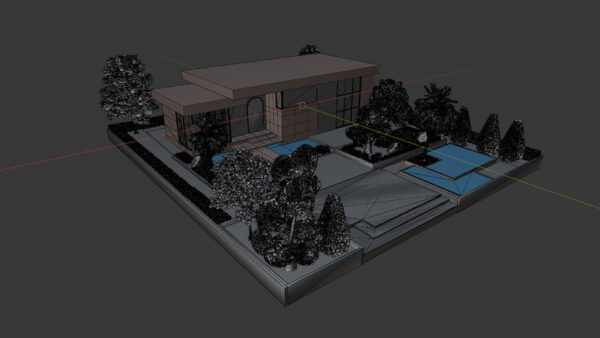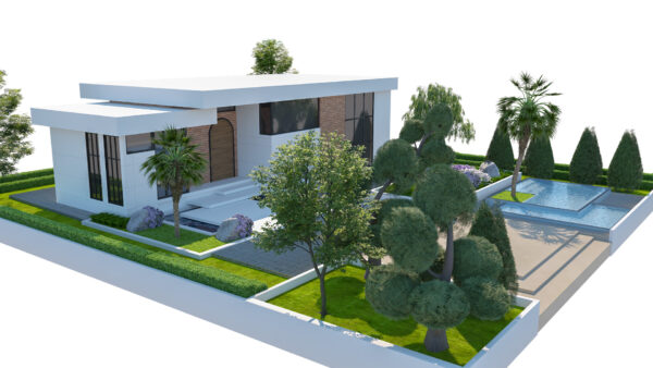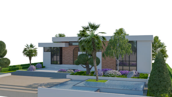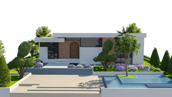 A high-quality, game-ready 3D model of a Contemporary Single-Story Villa featuring modern architectural design and lush, detailed landscaping. This asset is perfect for architectural visualization, open-world environments, real-time engines (like Unity, Unreal Engine), and high-end rendering projects. The design combines clean, white facades with warm brick accents, large glass windows, and striking outdoor amenities.