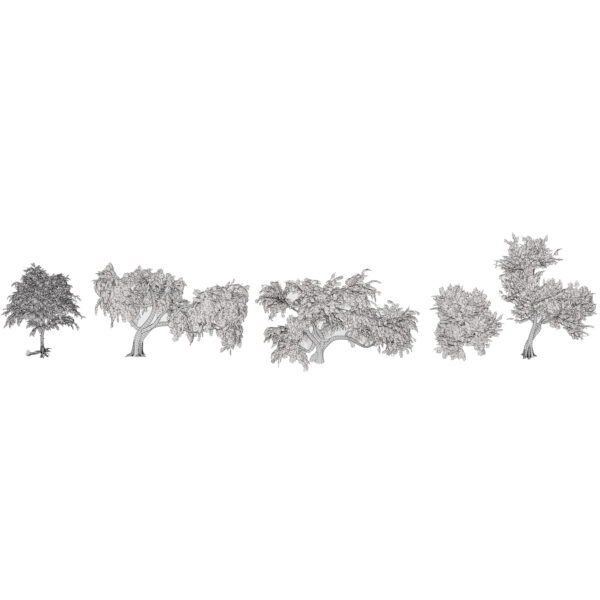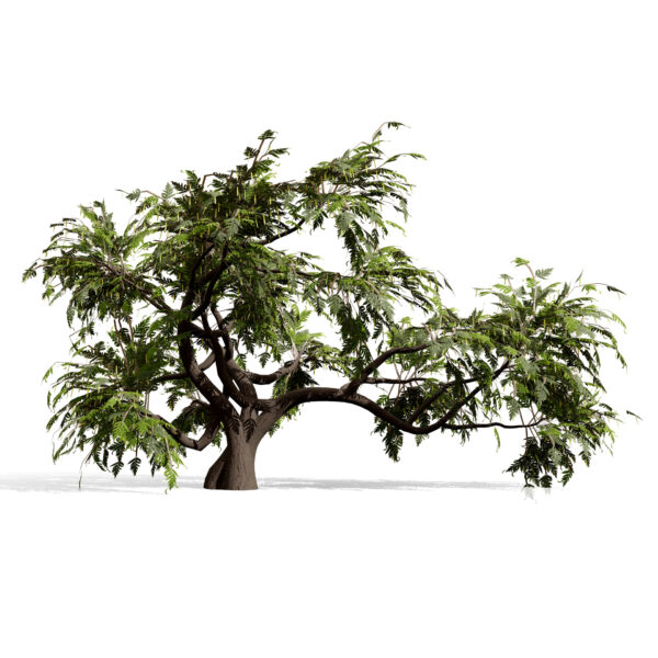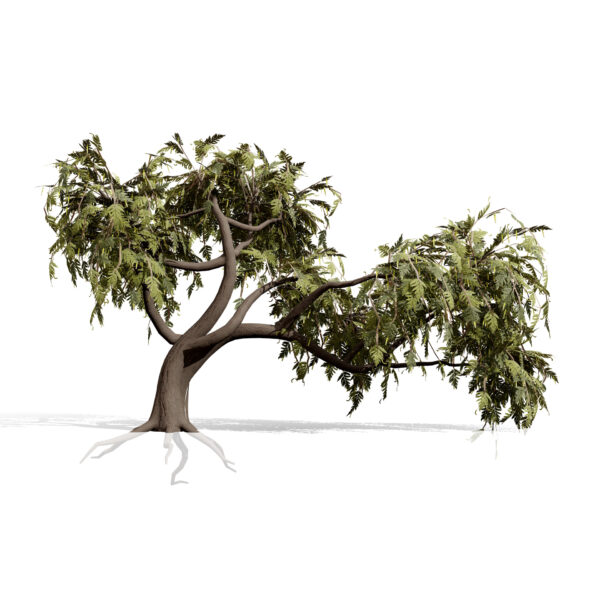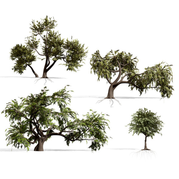 This asset pack features four distinct growth variations, ranging from a solitary upright tree to complex, multi-stemmed, and windswept forms typical of desert landscapes. The models showcase the tree’s signature gnarled bark, intricate branch structure, and delicate, feathery foliage, making them perfect for close-up architectural visualizations or large-scale environmental scattering.