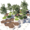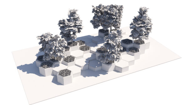 Bring your architectural scenes to life with this Modern Modular Hexagonal Urban Furniture & Planter Set. This model features a dynamic, multi-tiered layout that seamlessly blends nature with functional seating. The design consists of robust concrete-textured planters and warm, dark-wood seating platforms, creating a sophisticated aesthetic for any contemporary environment.