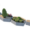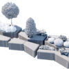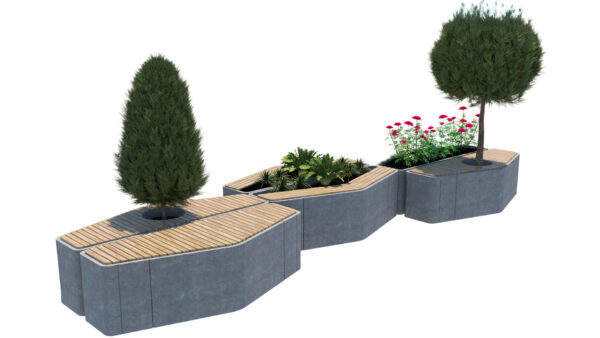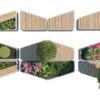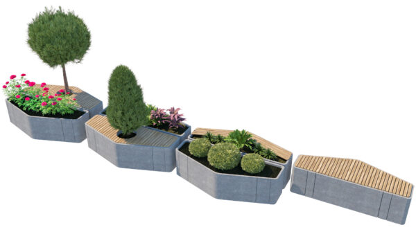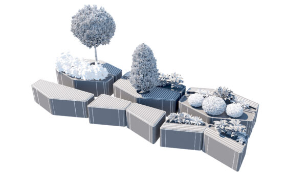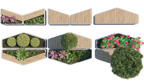 The set is built on a modular hexagonal and trapezoidal grid, allowing you to create endless configurations—from simple standalone benches to winding social “islands” and complex landscape arrangements.