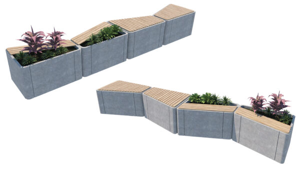 Elevate your outdoor environments with this versatile Modular Urban Furniture Set. Designed with a contemporary geometric aesthetic, this collection combines rugged concrete bases with warm wooden slat seating and integrated lush vegetation.