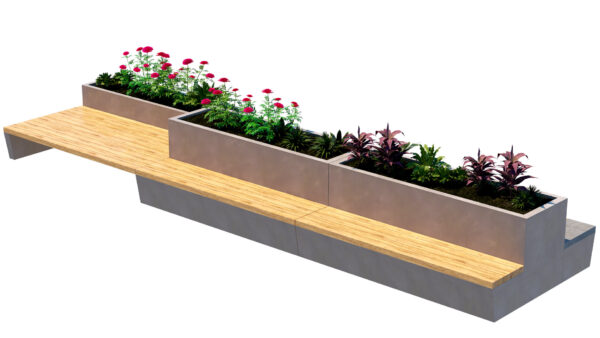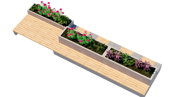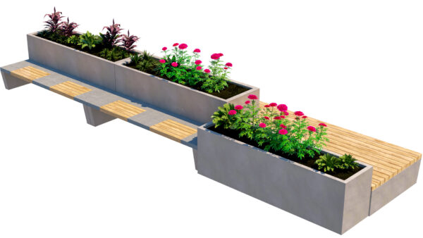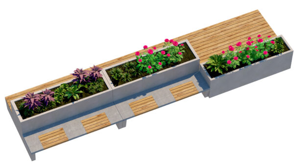 This high-quality 3D model features a modern modular planter bench designed for urban landscapes, public spaces, parks, plazas, and contemporary outdoor environments. The asset combines exposed concrete planters with wooden seating surfaces, creating a minimalist yet functional piece of street furniture.