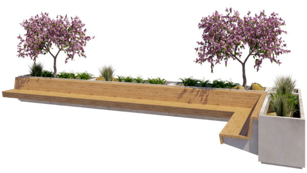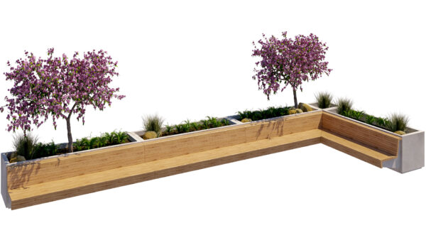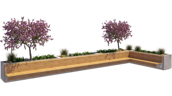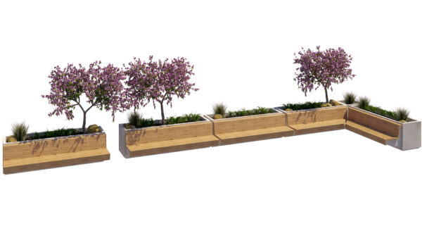 This high-quality 3D model features a modern modular planter bench system, designed for urban landscapes, public spaces, plazas, courtyards, and contemporary outdoor environments. The asset combines wooden seating surfaces with integrated concrete planters and lush vegetation, creating a functional and aesthetic street furniture solution.