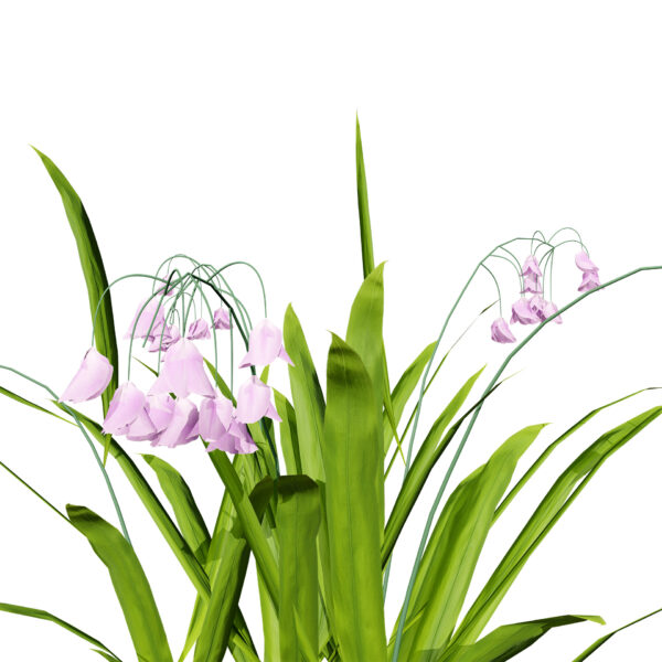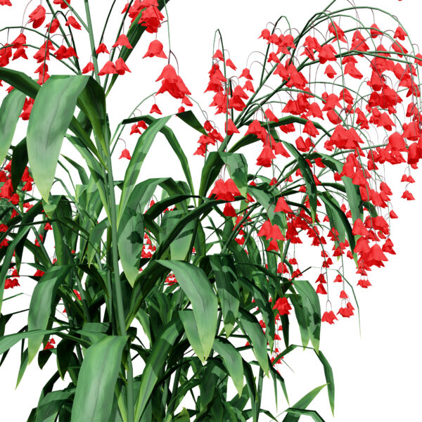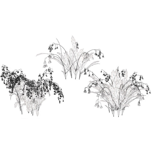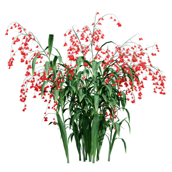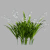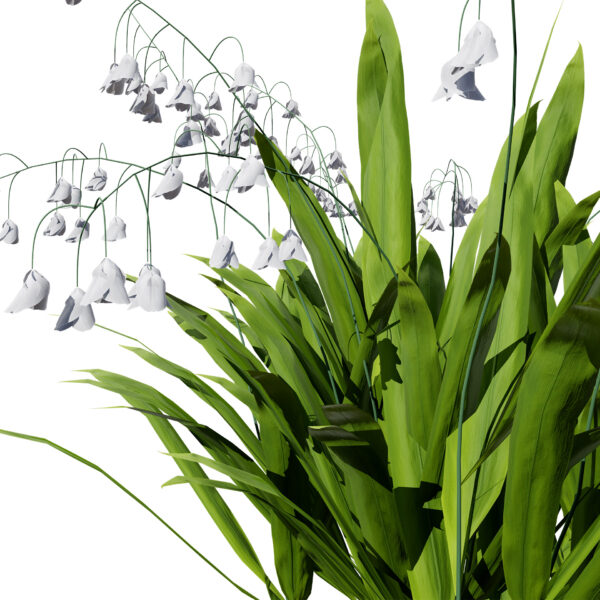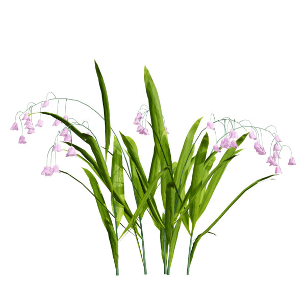 The plants in your image appear to be 3D models of Convallaria majalis (Lily of the Valley) and a taller plant with red flowers that is not Lily of the Valley, but a separate species added for variety. The Lily of the Valley models show two variants: one with classic white flowers and another with pink flowers (Convallaria majalis ‘Rosea’ or similar).
