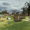 A vibrant children’s playground with slides, swings, and climbing structures.