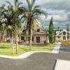 Rich Landscaping: Features abundant tropical palm trees, various evergreen trees, bushes, and well-maintained grassy areas, creating a lush, appealing environment.