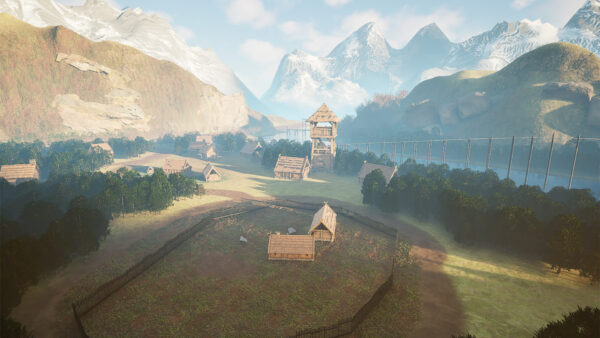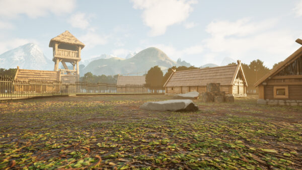 • Authentic Village Architecture: The pack includes a variety of wooden Nordic-style houses with thatched roofs, surrounded by simple fences and scattered across the rolling terrain. A prominent watchtower stands guard, offering a sense of community and security.