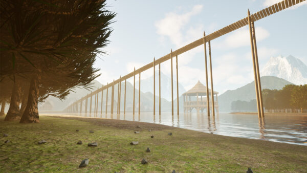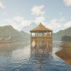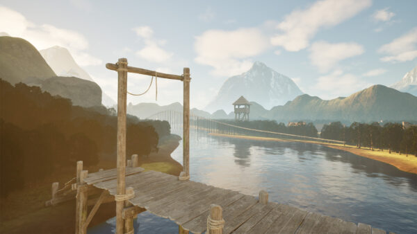 • Detailed Natural and Structural Assets: A key highlight is the long suspension bridge that stretches across the river, connecting different parts of the environment. A rustic wooden dock and a small, inviting riverside hut add to the scene’s charm and functionality. Other details include large, mossy rocks and a stone-ringed campfire, perfect for creating dynamic and engaging scenes.